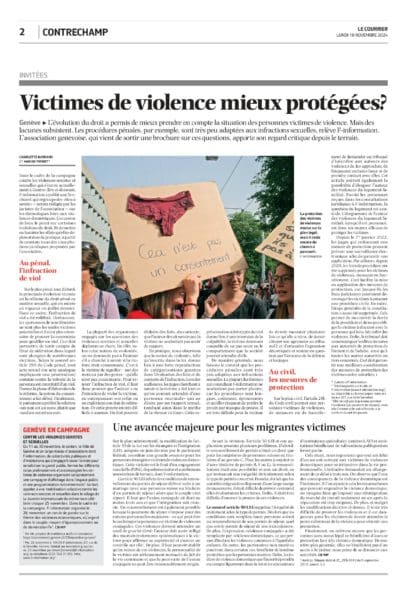 Le Courrier a publié le 6 novembre un article résumant le bon à savoir « Qu’est-ce que la violence domestique et comment en sortir? », rédigé par Marine Pernet, juriste à F-information.